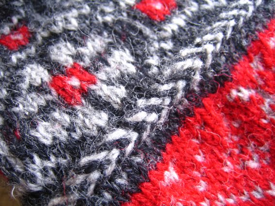 Tycker att det där mönstret gjorde sig himla bra i svartvittrött. De lettiska vantarna är väl annars kända för sina bjärta färger och knasiga färgmatchningar, men jag kände att innan jag börjar sticka på ett par orange vantar med rosa och ärtgröna flätor (fint!) så kör jag på en lite mer nedtonad färgskala.
